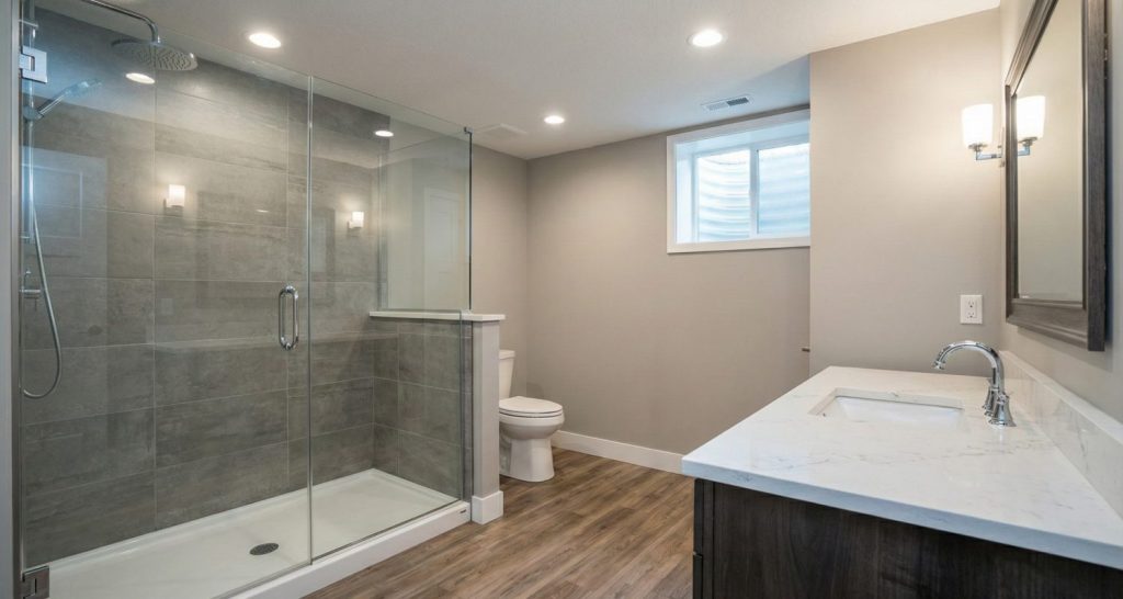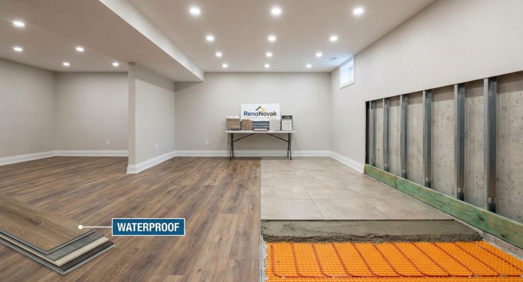 - Planchers : Nous déconseillons fortement le bois franc massif au sous-sol, car il absorbe l’humidité et a tendance à gondoler. Les meilleurs choix sont les planchettes de vinyle de luxe (LVP) — qui sont 100 % imperméables, durables et chaudes sous les pieds — ou la céramique avec planchers chauffants (systèmes Schluter).