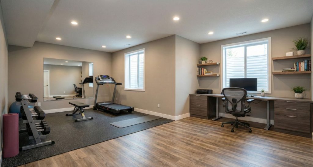 - Bureau à domicile et salle d’entraînement : Les sous-sols sont naturellement plus frais, ce qui les rend idéaux pour les gyms à domicile. Pour les bureaux, nous privilégions un design d’« éclairage étagé » (layered lighting) pour compenser le manque de lumière naturelle, créant ainsi un environnement lumineux et productif.