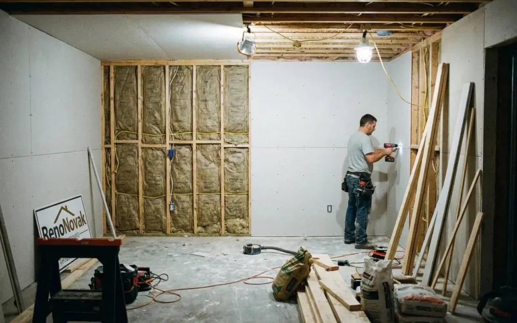 - Charpente et division : Construction de nouveaux murs avec des matériaux résistants à l’humidité (montants métalliques ou bois traité) pour définir les chambres, salles de bain et aires de vie.
